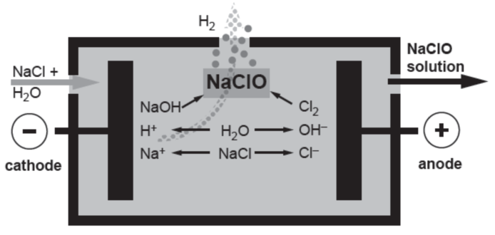 2 極間反應(yīng):2NaOH + Cl2 =>NaClO + NaCl + H2O